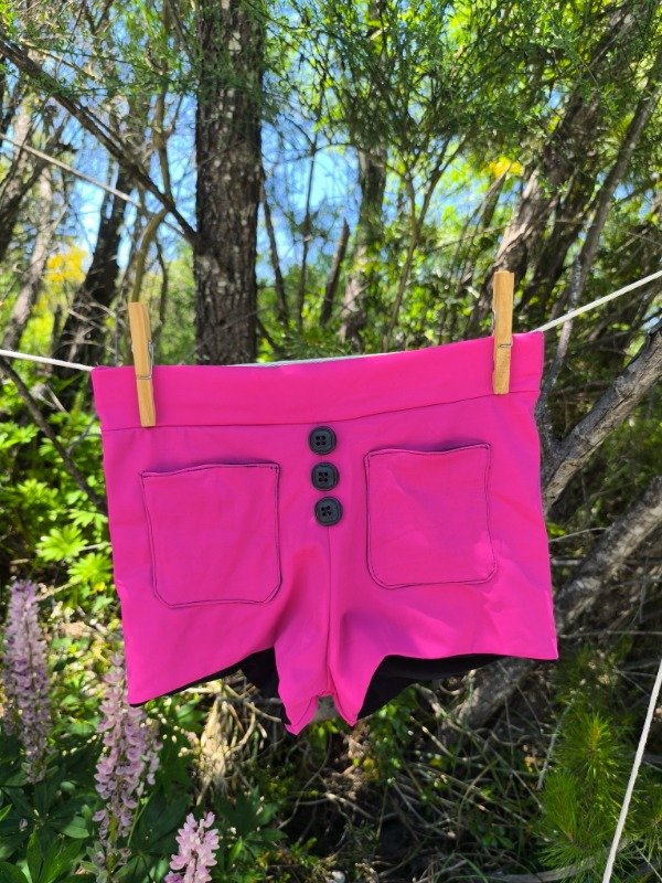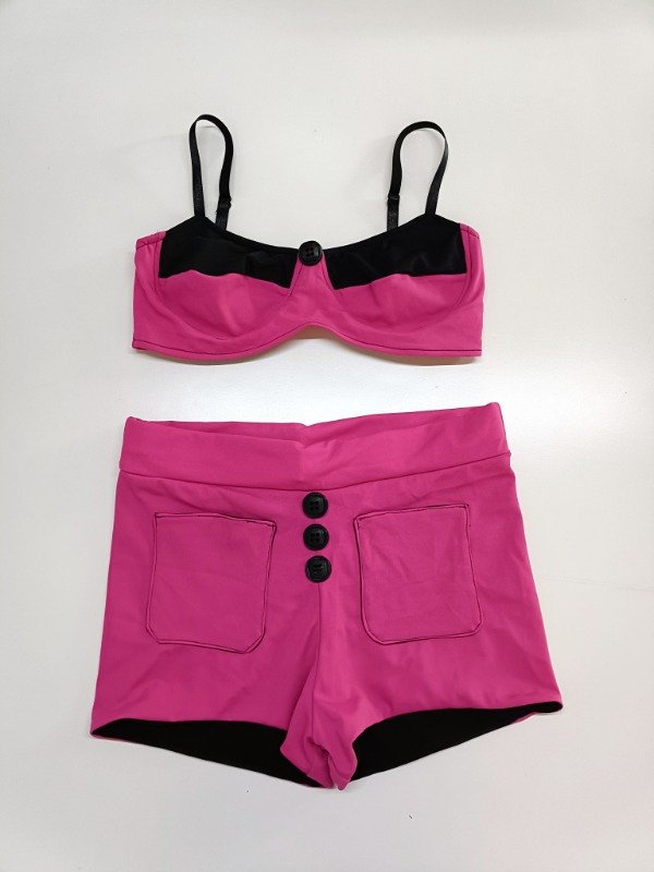 Bikini de lycra premium color negro y fucsia. Busto y short con forro de lycra. Breteles ajustables. Bolsillos utilitarios. Con botones decorativos.