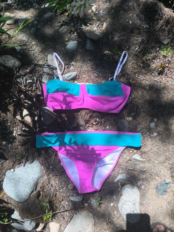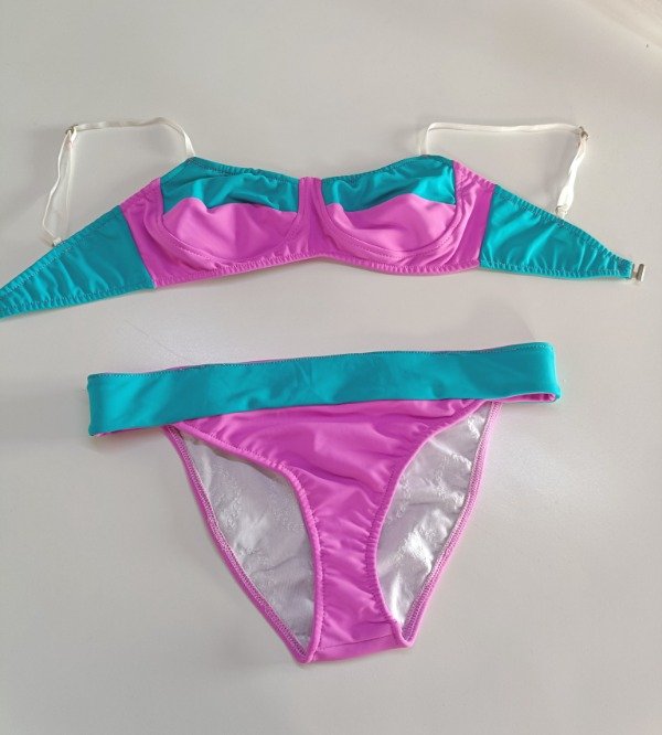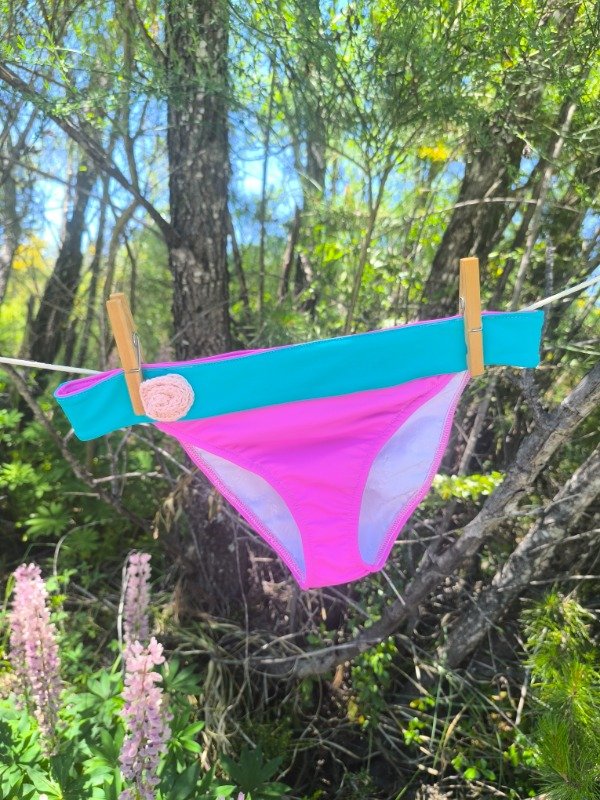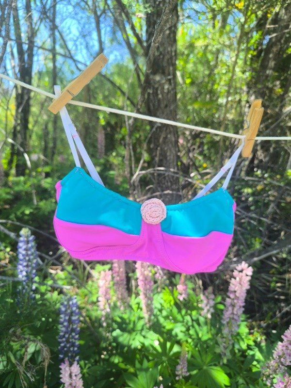 Bikini de lycra premium. Vedetina y busto forrados. Breteles ajustables. Flor de crochet decorativa opcional.